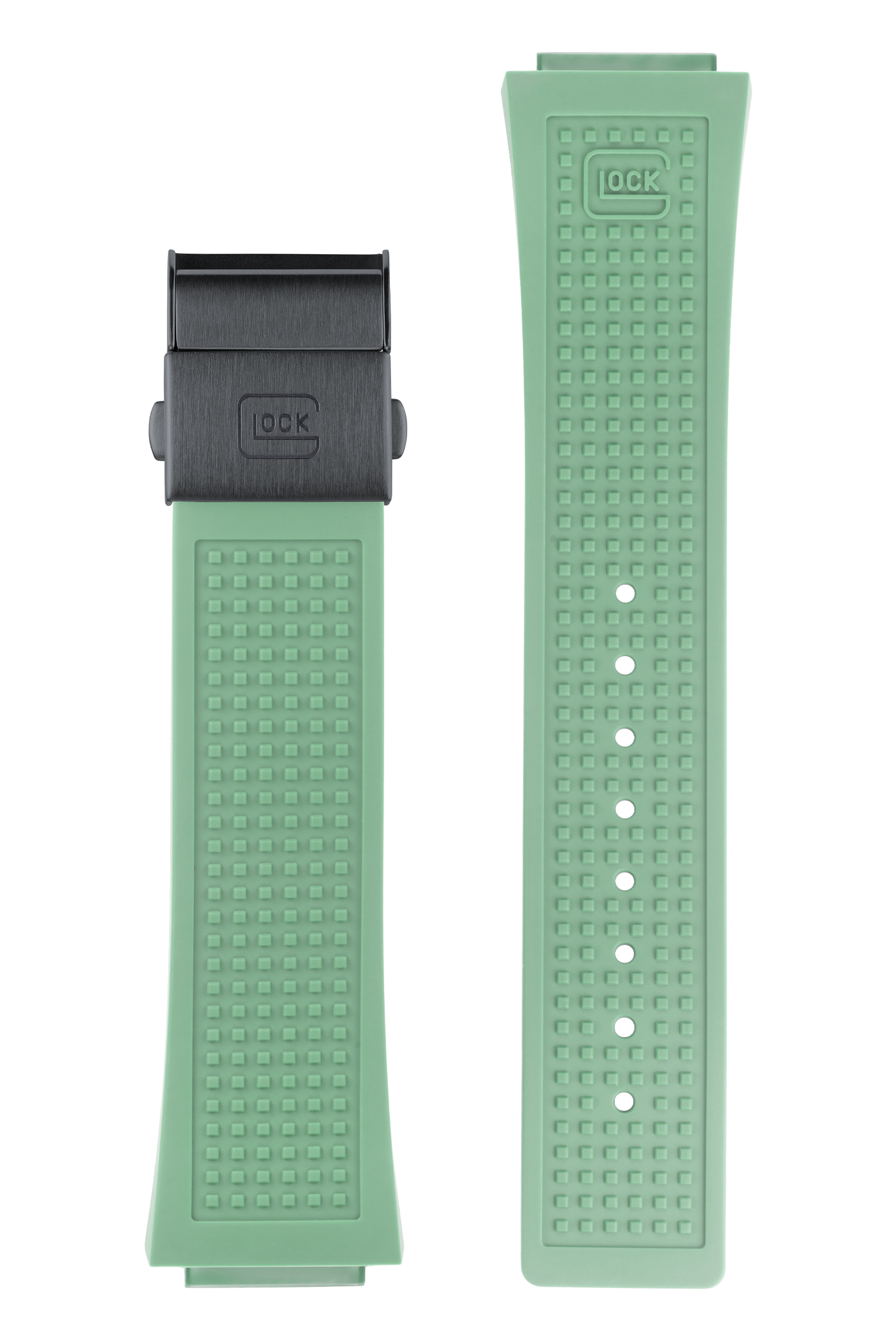 This silicone strap, adorned with the characteristic GLOCK RTF texture, combines durability with comfort. The mint green strap is available in three sizes and is complemented by the black clasp. Match the last two digits of the item number for a GLOCK Watch and for a strap to ensure compatibility.