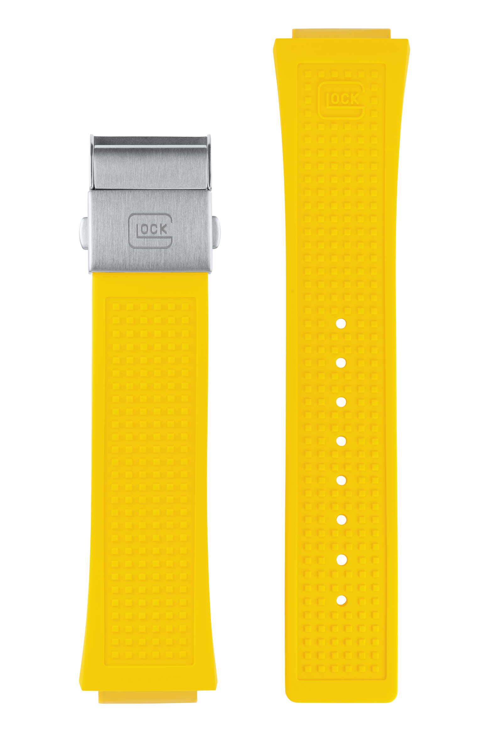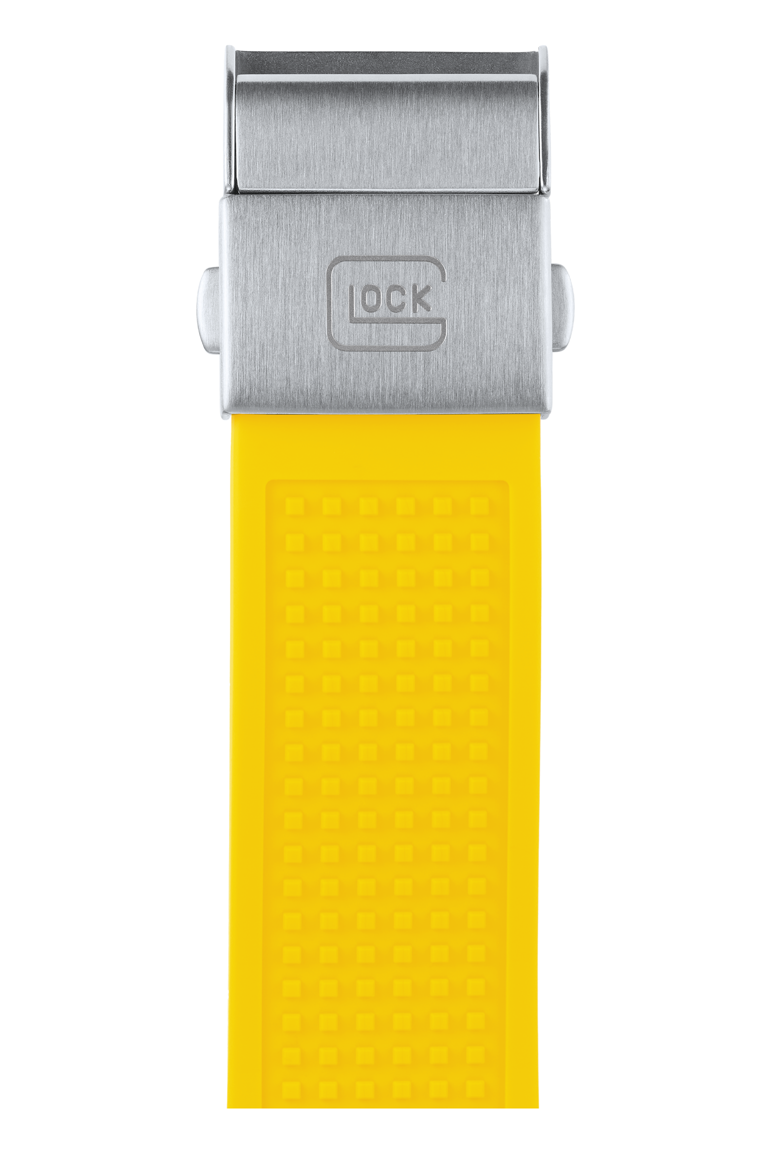 This silicone strap, adorned with the characteristic GLOCK RTF texture, combines durability with comfort. The yellow strap is available in two sizes and is complemented by the silver-tone clasp. Match the last two digits of the item number for a GLOCK Watch and for a strap to ensure compatibility.