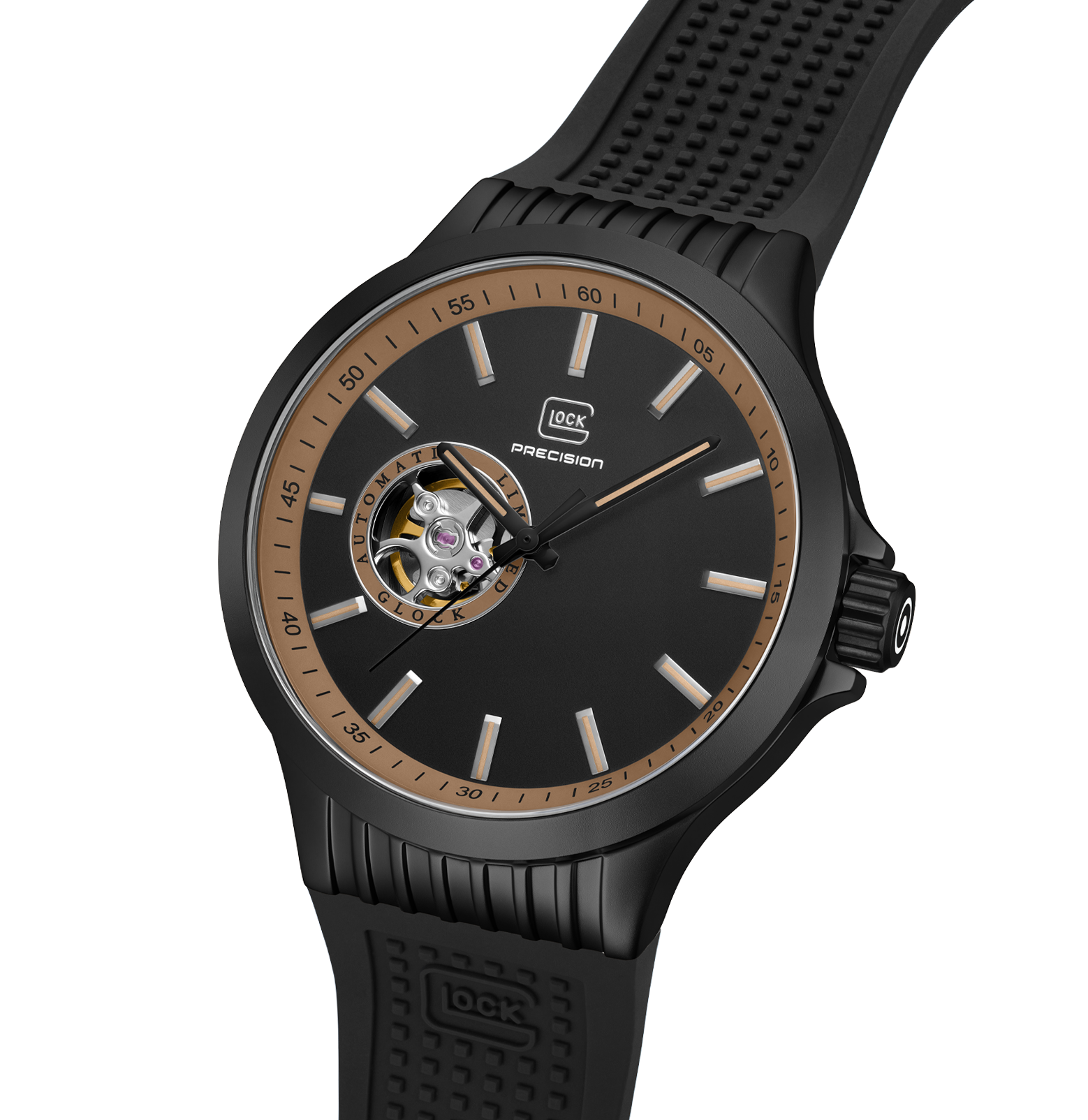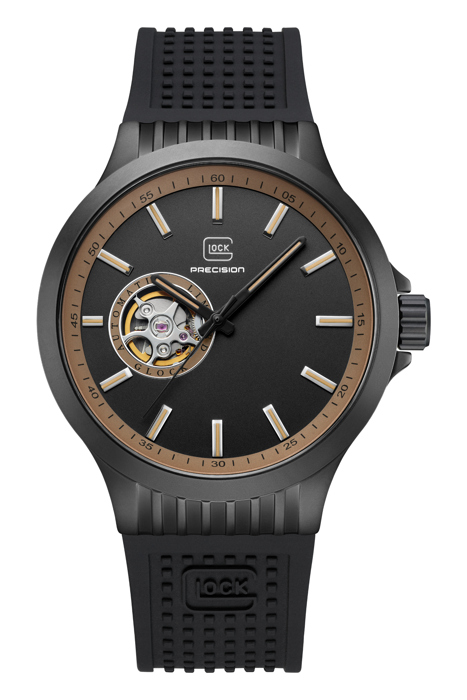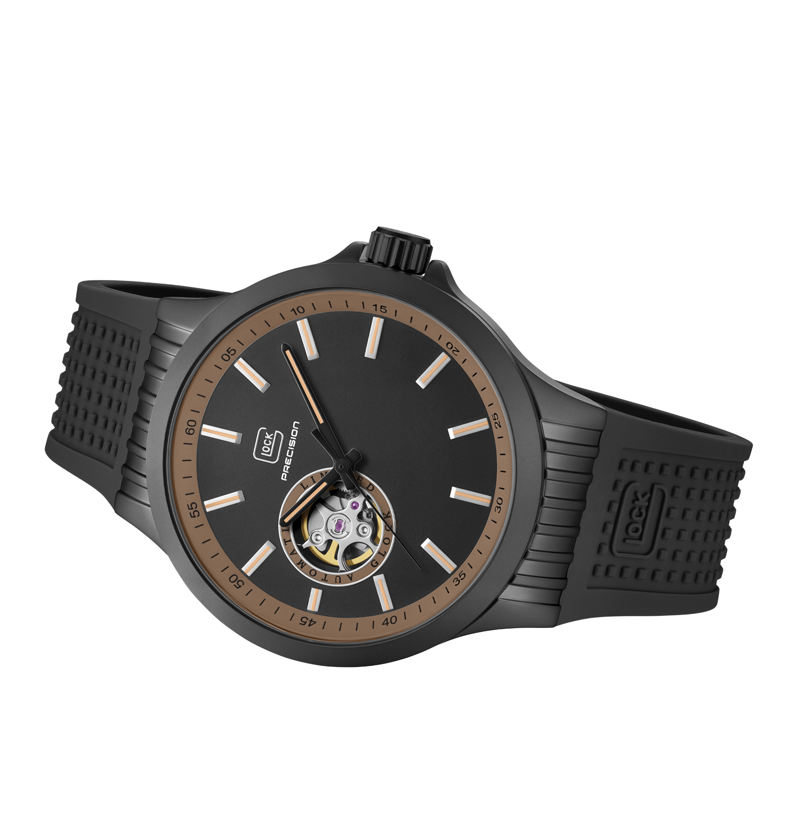 Mechanical precision meets contemporary style in this refined automatic timepiece. The gunmetal-tone stainless steel case frames a matching dial accented by a warm brown outer ring, creating a sophisticated depth of contrast. Its open-heart design reveals the intricate motion of the automatic movement within—a tribute to mechanical craftsmanship. Hands and indices coated with Swiss Super-LumiNova® ensure optimal legibility in any light. The black silicone strap, featuring GLOCK’s signature RTF texture, adds a modern, tactical edge while ensuring lasting comfort. With a water resistance of 10 ATM, this watch unites engineering excellence, resilience, and unmistakable GLOCK design.