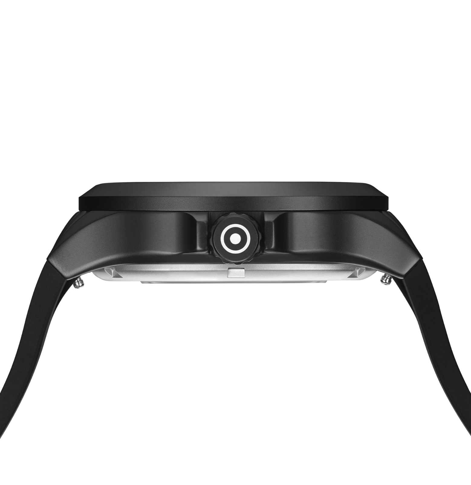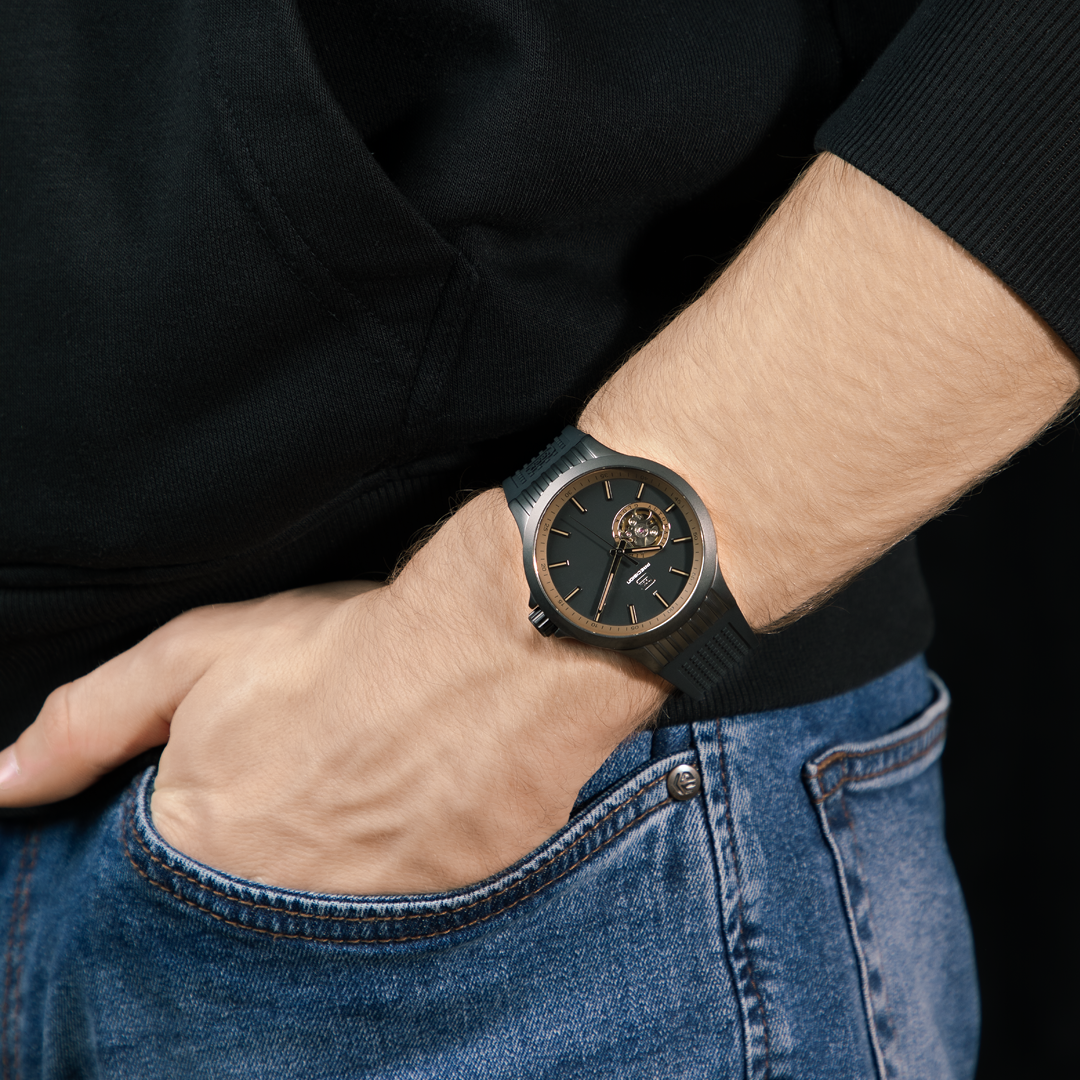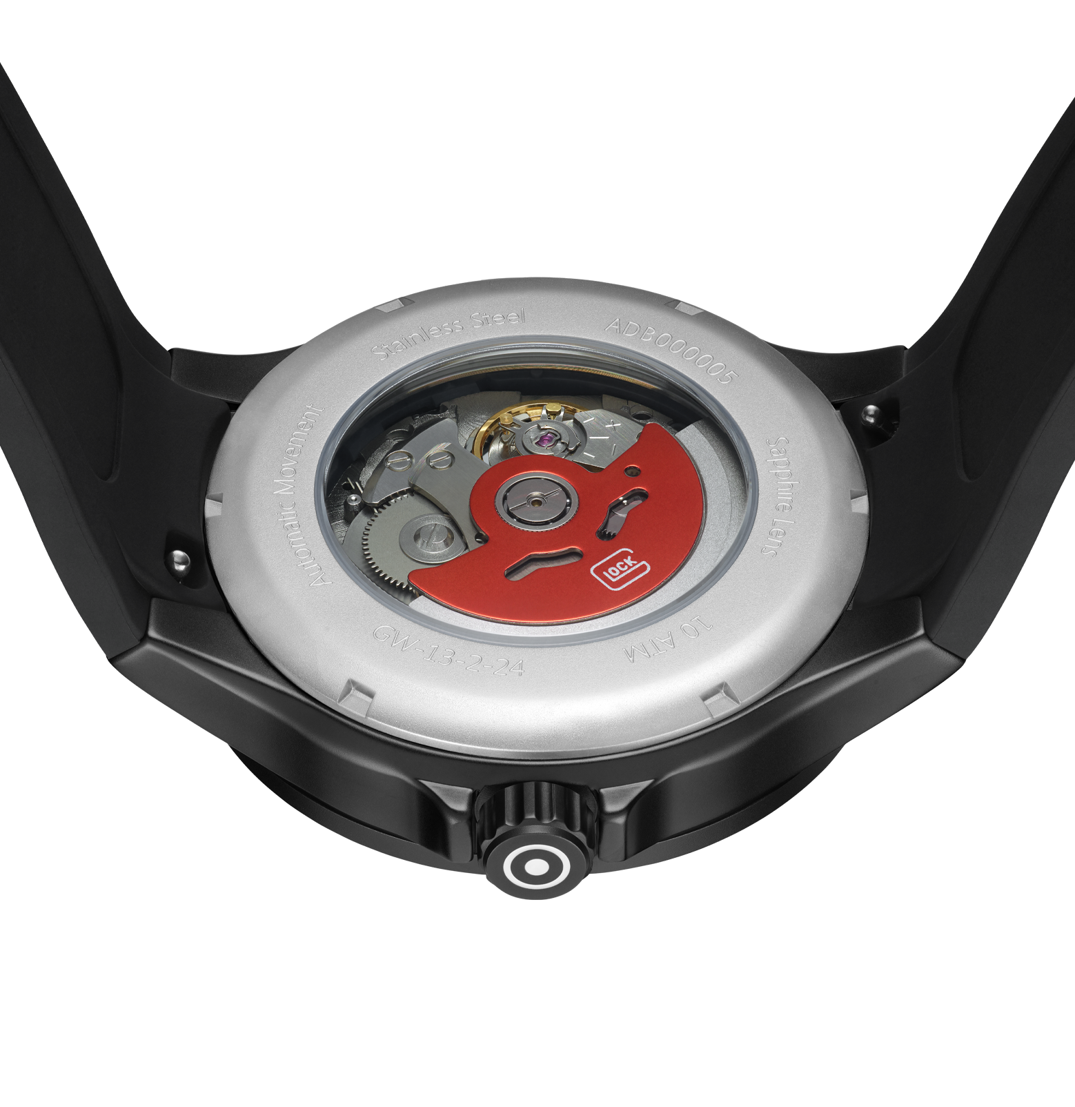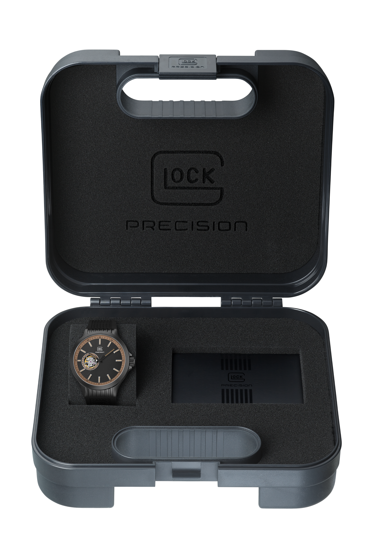 Mechanical precision meets contemporary style in this refined automatic timepiece. The gunmetal-tone stainless steel case frames a matching dial accented by a warm brown outer ring, creating a sophisticated depth of contrast. Its open-heart design reveals the intricate motion of the automatic movement within—a tribute to mechanical craftsmanship. Hands and indices coated with Swiss Super-LumiNova® ensure optimal legibility in any light. The black silicone strap, featuring GLOCK’s signature RTF texture, adds a modern, tactical edge while ensuring lasting comfort. With a water resistance of 10 ATM, this watch unites engineering excellence, resilience, and unmistakable GLOCK design.