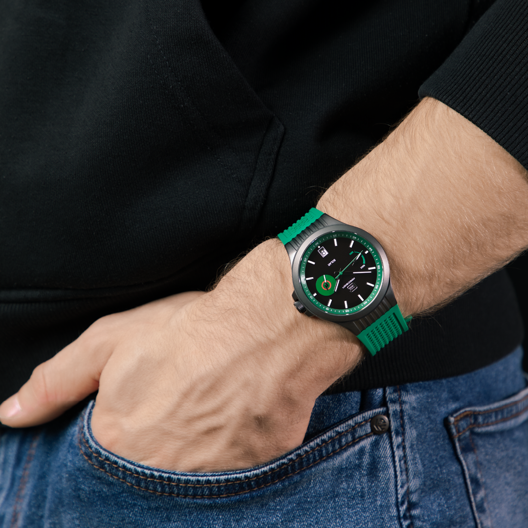 A combination of precision and functionality. The stainless-steel case in gunmetal encloses a deep black dial illuminated by indices and hands with Swiss Super-LumiNova®. A standout feature of the dial is the power reserve indicator, ensuring you always have insight into your watch's solar energy status, accompanied by the distinctive detail of a bullet casing with red accents. Complemented by a sporty green silicone strap with GLOCK's RTF structure, powered by a reliable solar movement, and rated to 10 ATM water resistance, this watch represents sophisticated design and technical precision.