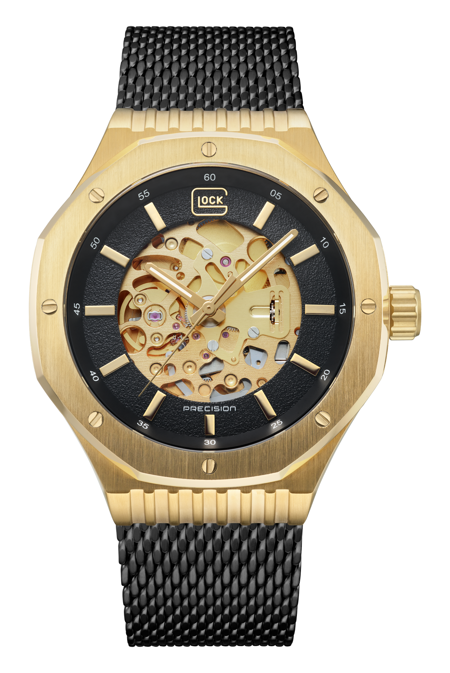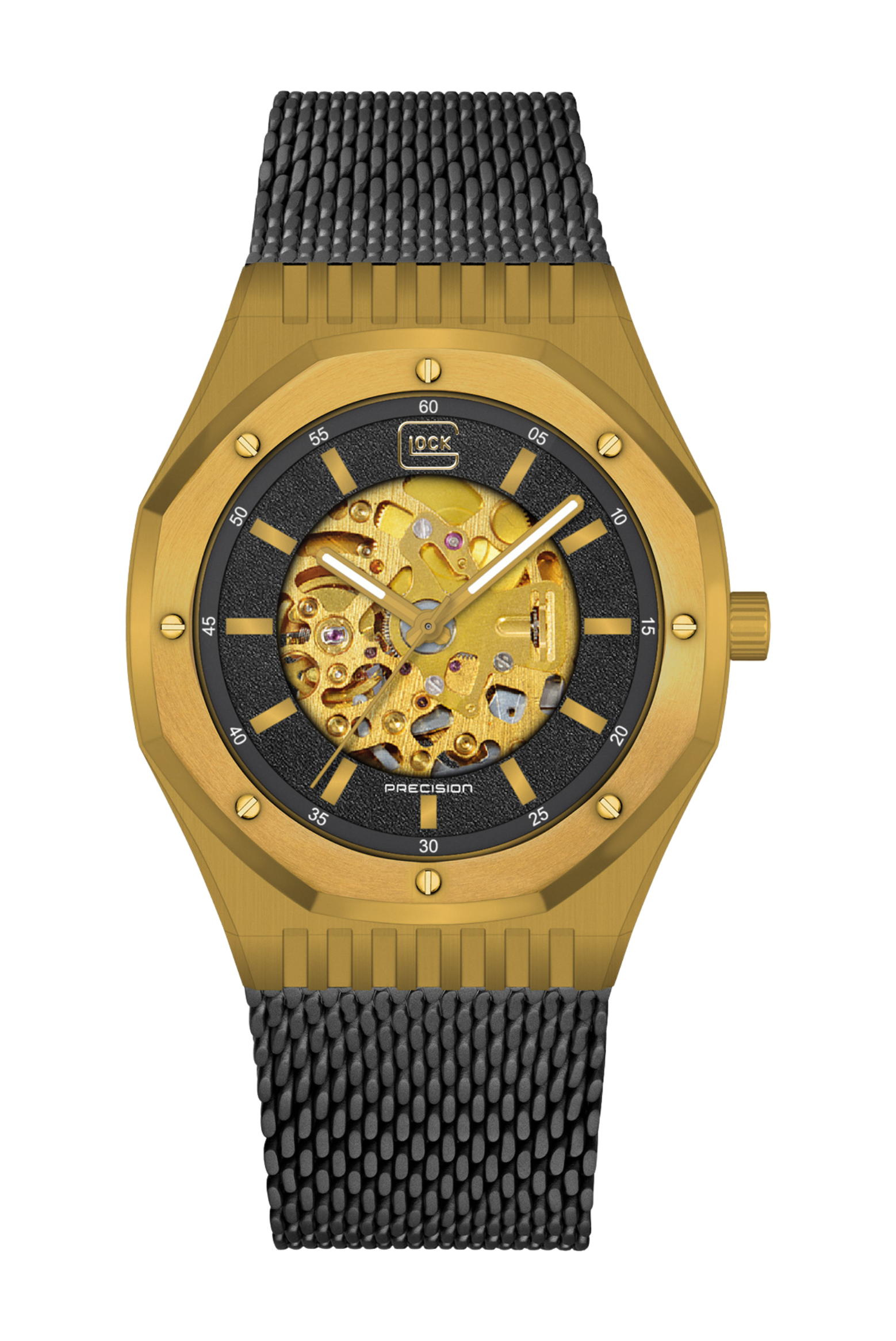 Mechanical mastery meets modern elegance in this captivating timepiece. The gold-tone stainless steel case surrounds a black skeletonized dial that reveals the intricate workings of the automatic movement beneath—its gold-toned components adding depth and refinement to the design. Gold-tone hands, enhanced with Swiss Super-LumiNova®, ensure clarity and visibility, while the matching indices provide a harmonious balance. The black mesh strap completes the sophisticated appearance, offering both comfort and contemporary appeal. With a water resistance of 10 ATM, this watch stands as a testament to craftsmanship, precision, and timeless style.