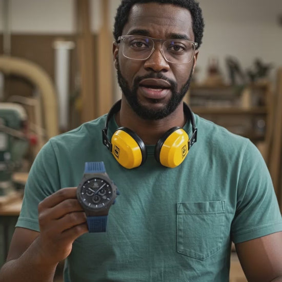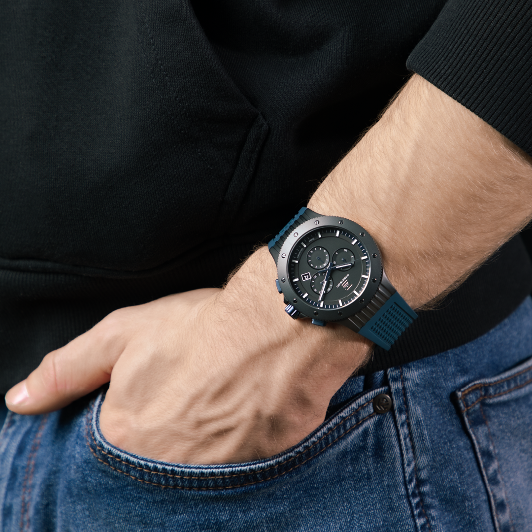 This 7500-piece limited-edition wristwatch symbolizes precision craftsmanship. Its black titanium case is enriched by blue accents on the dial. Hands and indices with Swiss Super-LumiNova® ensure readability of the time even in low-light conditions. The watch is powered by a reliable Swiss movement, features a chronograph function, and boasts a water-resistance rating of 20 ATM. To offer versatility of style, each order comes with two interchangeable straps: a blue silicone strap with GLOCK's RTF texture and a black mesh strap.