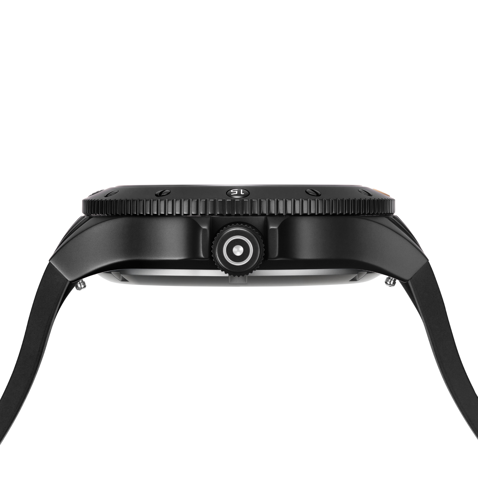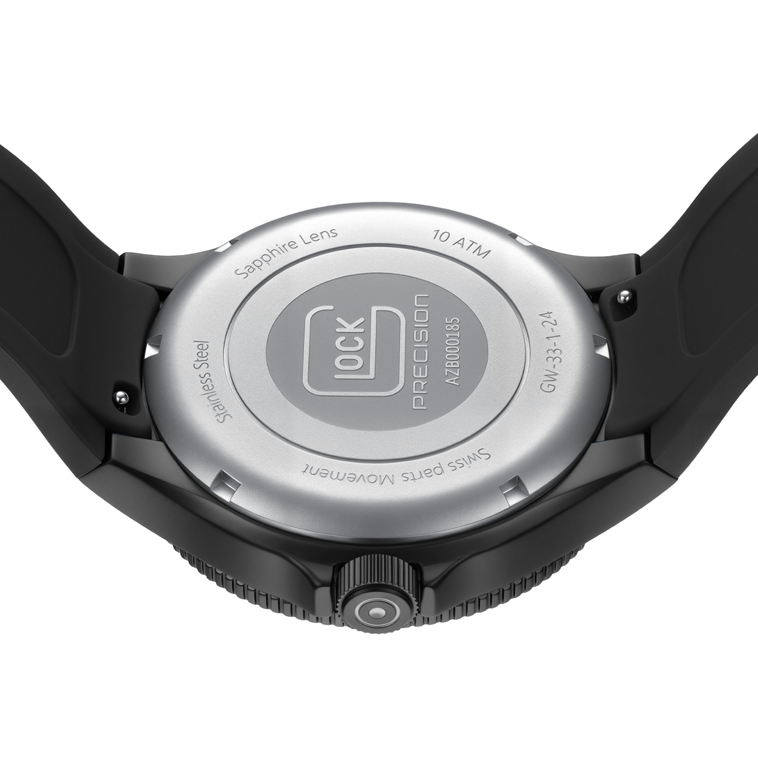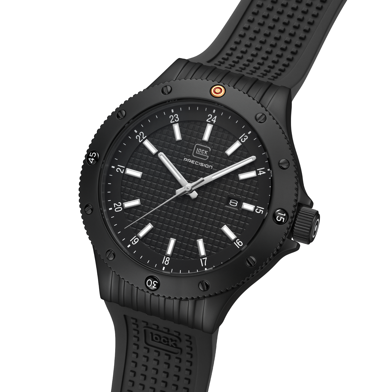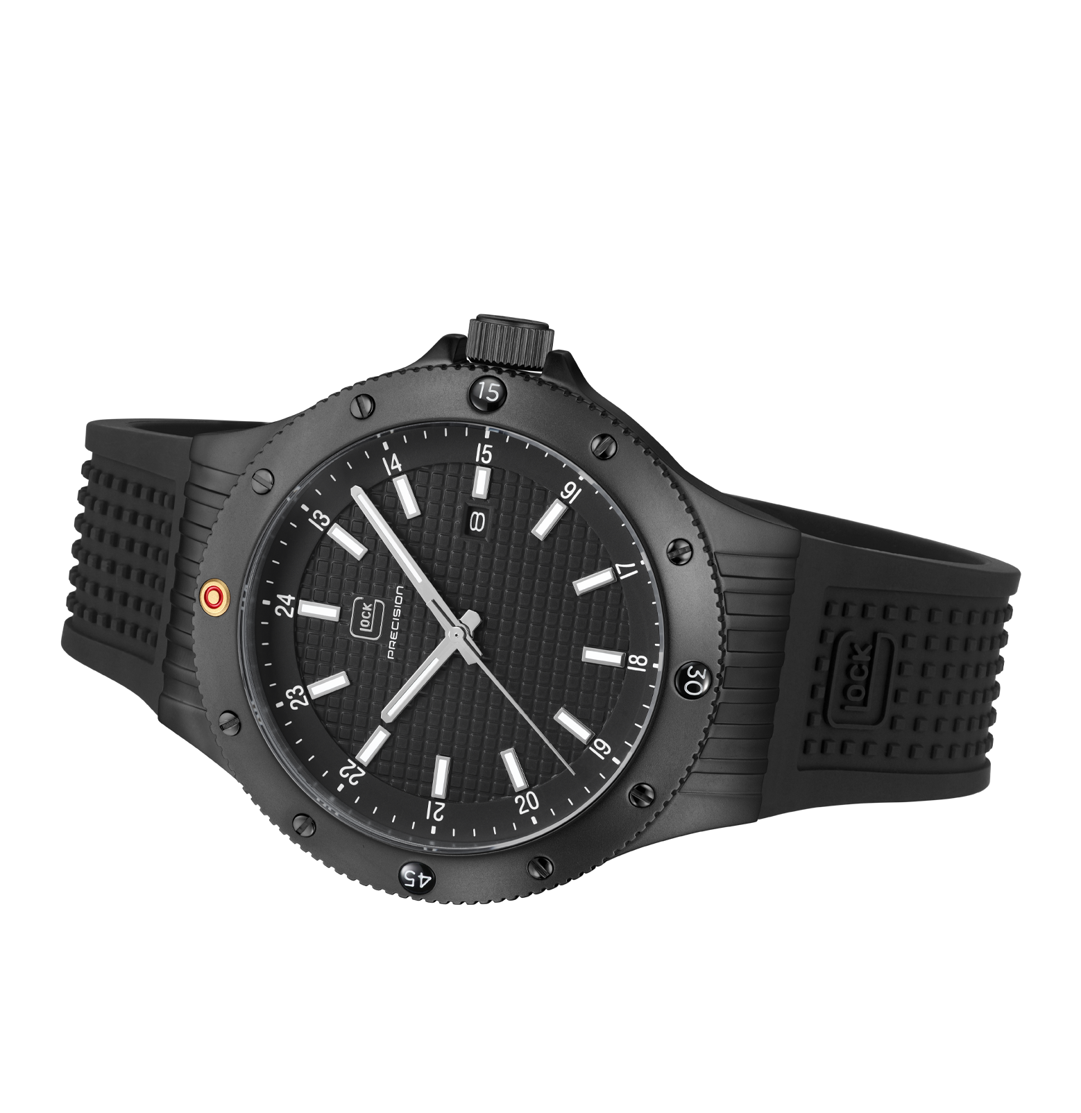 Strength meets sophistication in this distinctive timepiece. Encased in black sandblasted stainless steel, the black dial featuring GLOCK’s iconic RTF structure captures the essence of precision engineering. A bullet detail on the bezel reinforces its bold identity, while silver-tone hands and indices with Swiss Super-LumiNova® ensure optimal legibility in any light. The black silicone strap, also featuring the RTF texture, provides a secure and comfortable fit. With a water resistance of 10 ATM, this watch exemplifies durability and technical finesse—engineered for those who value both performance and style.