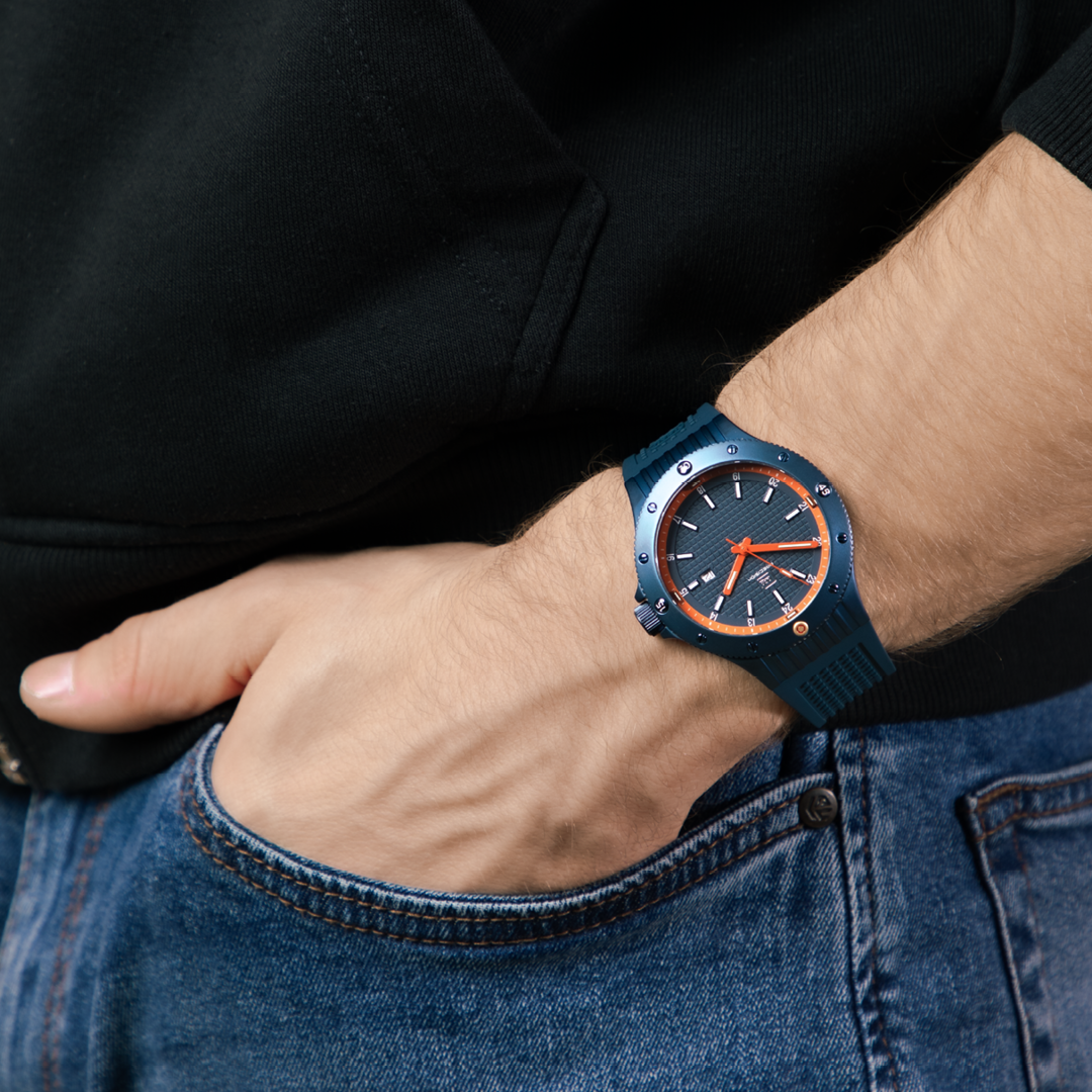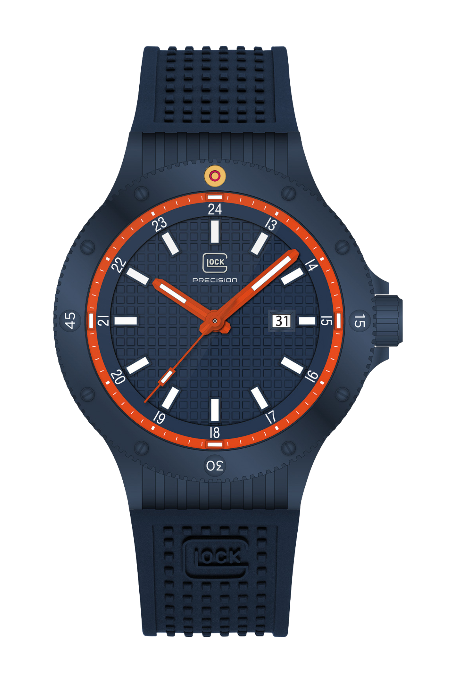 Precision and bold design converge in this striking timepiece. The dark blue sandblasted stainless steel case frames a matching dial enhanced by GLOCK’s distinctive RTF structure and an orange inner ring that adds a dynamic accent. Trigalights® integrated into the hands and at the 12, 3, 6, and 9-hour markers ensure constant readability, complemented by Swiss Super-LumiNova® for superior visibility in any environment. The orange hands stand out against the dark background, reinforcing its modern, tactical character. Completing the look, the dark blue silicone strap with RTF texture guarantees both comfort and durability. Powered by a precise Swiss movement and water-resistant to 10 ATM, this watch embodies performance, reliability, and unmistakable GLOCK style.