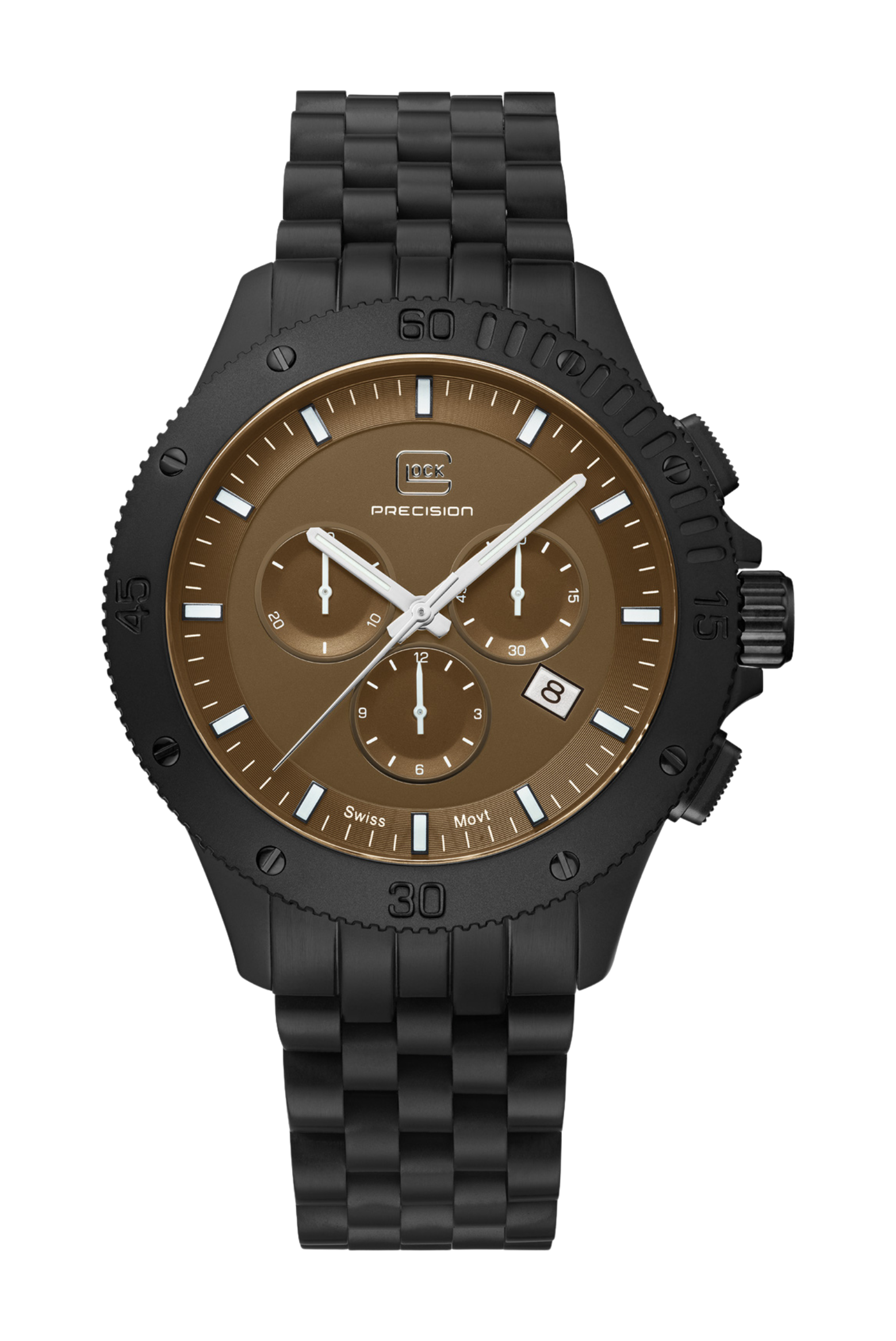 Power and precision define this commanding timepiece. Encased in black sandblasted stainless steel, the fully brown dial creates a striking contrast against silver-tone hands and indices enhanced with Swiss Super-LumiNova® for optimal visibility. The integrated chronograph function underscores its technical capability, while the robust black stainless steel link strap ensures a confident, comfortable fit. Driven by a reliable Swiss movement and water-resistant to 20 ATM, this watch embodies strength, endurance, and refined design—crafted for those who demand performance without compromise.