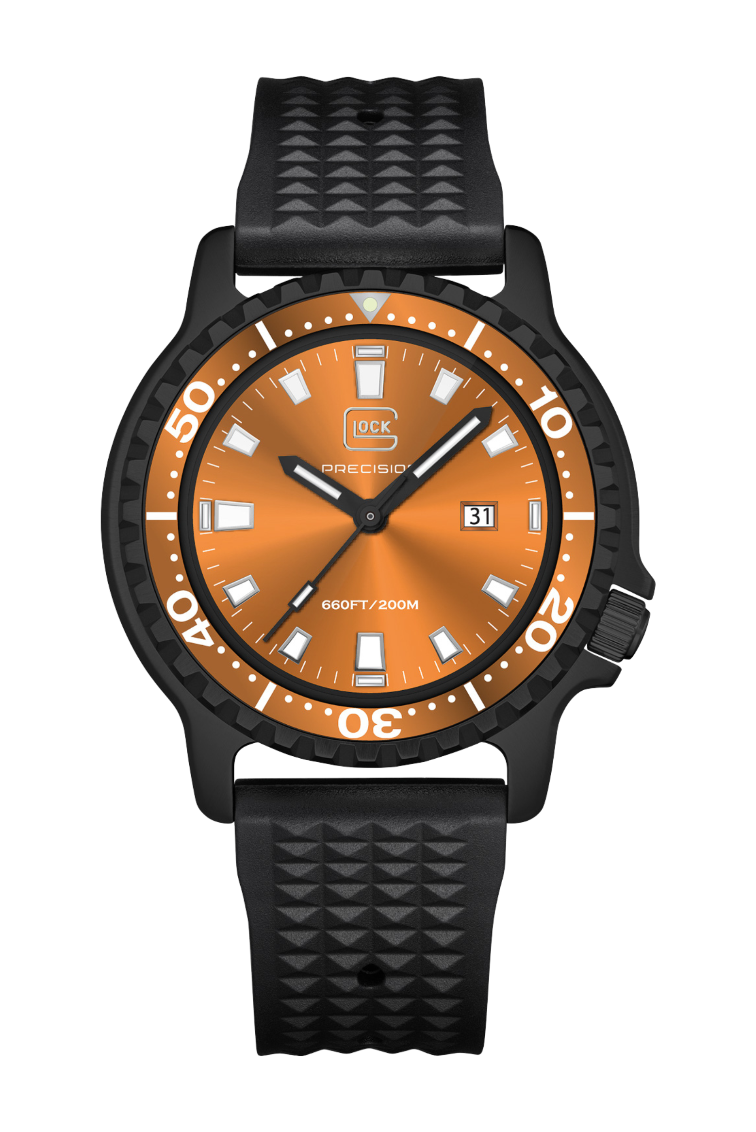 Bold aesthetics meet uncompromising performance in this diver-style timepiece. The matte black stainless steel case surrounds a vivid orange dial that commands attention while ensuring optimal readability beneath any light condition. White-accented hands and indices stand out sharply against the dial, enhanced by Trigalights® at the 12, 3, 6, and 9-hour positions and Swiss Super-LumiNova® on the remaining markers. The black silicone strap offers lasting comfort and durability, perfectly complementing the watch’s dynamic character. Driven by a precise Swiss movement and water-resistant to 20 ATM, this watch unites functionality, resilience, and the unmistakable confidence of GLOCK design.